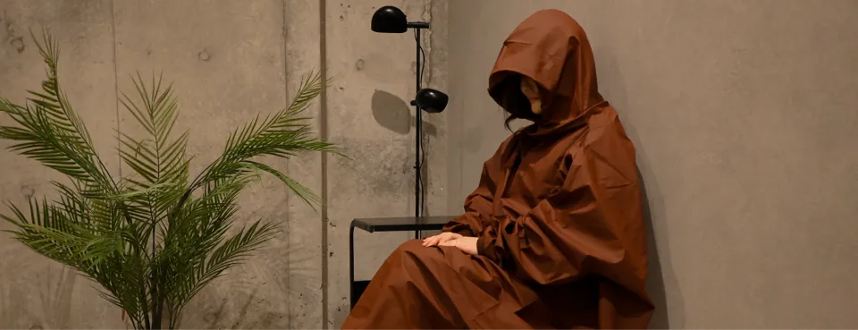 マントを被り、よもぎ蒸気を全身へ。